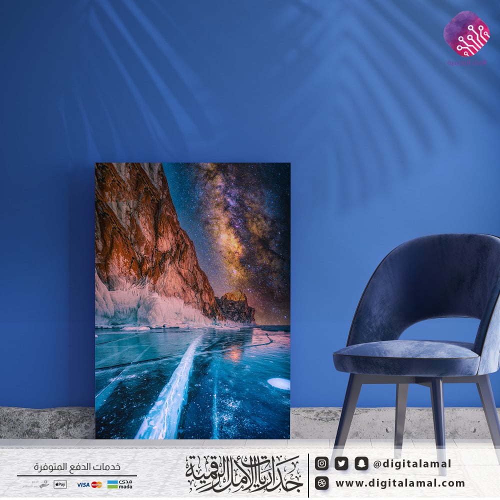 لوحة جدارية مميزة لبحيرة متجمدة والسماء المليئة بالنجوم ليلاً-لوحة جدارية مطبوعة بجودة ودقة عالية على خامة الكانفاس مع إطار مخفي ومصممة باحترافية وبعناية بأجود أنواع الأحبار لتتماشى مع مختلف أنواع الديكورات العصرية.