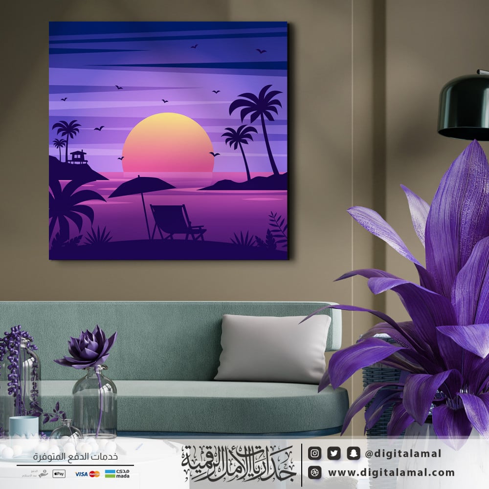 لوحة جدارية مميزة لغروب الشمس على الشاطئ-لوحة جدارية مطبوعة بجودة ودقة عالية على خامة الكانفاس مع إطار مخفي ومصممة باحترافية وبعناية بأجود أنواع الأحبار لتتماشى مع مختلف أنواع الديكورات العصرية.