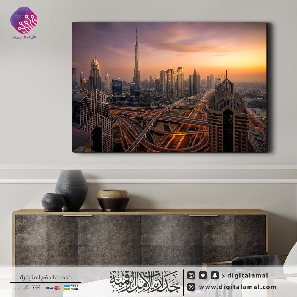 لوحة جدارية لناطحات السحاب في مدينة دبي-لوحة جدارية مطبوعة بجودة ودقة عالية على خامة الكانفاس مع إطار مخفي ومصممة باحترافية وبعناية بأجود أنواع الأحبار لتتماشى مع مختلف أنواع الديكورات العصرية.