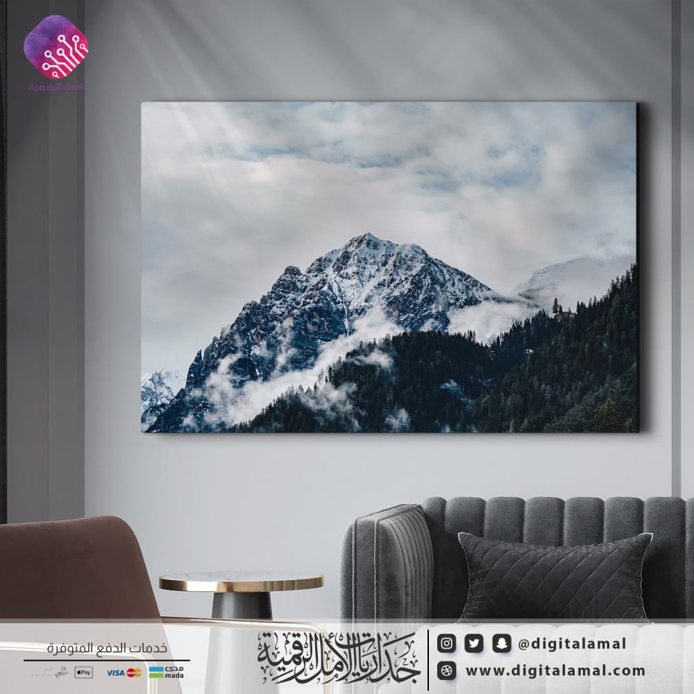لوحة جدارية تظهر الثلوج تغطي قمة أحد الجبال-لوحة جدارية تظهر أشجار وقمة أحد الجبال مغطاة بالثلوج ،مطبوعة بجودة ودقة عالية على خامة الكانفاس مع إطار مخفي ومصممة باحترافية وبعناية بأجود أنواع الأحبار لتتماشى مع مختلف أنواع الديكورات العصرية.