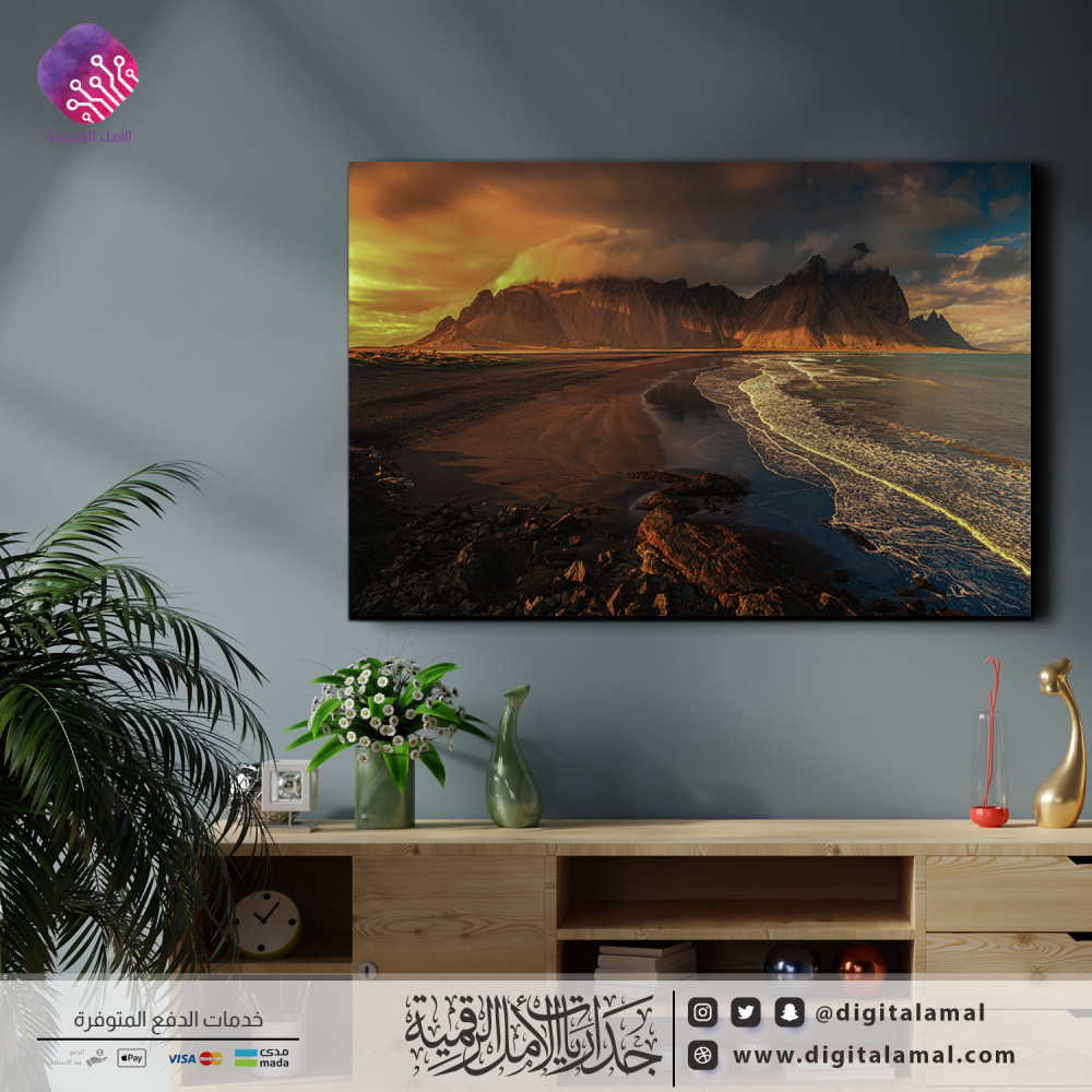 لوحة جدارية لشاطئ المحيط مع جبال خلفه-لوحة جدارية تظهر جبال مع شاطئ المحيط،مطبوعة بجودة ودقة عالية على خامة الكانفاس مع إطار مخفي ومصممة باحترافية وبعناية بأجود أنواع الأحبار لتتماشى مع مختلف أنواع الديكورات العصرية.