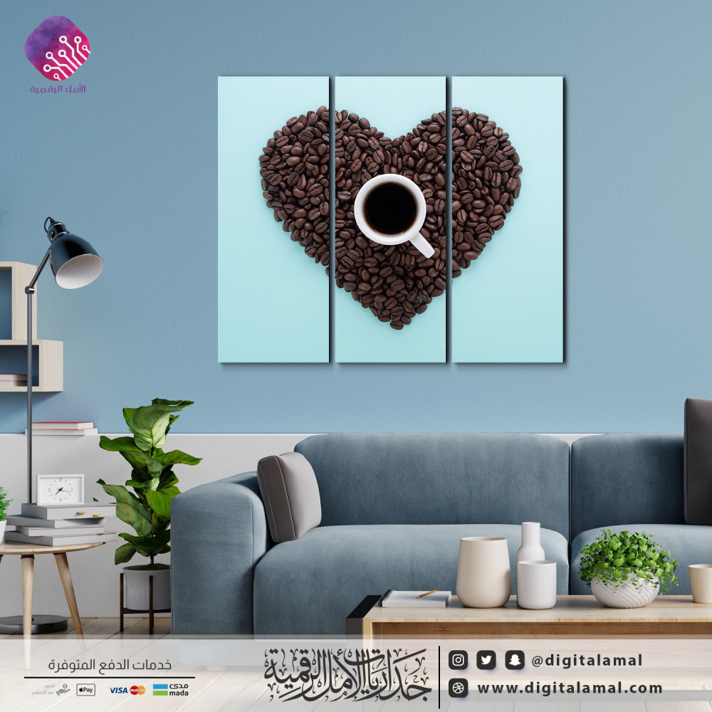 لوحات جدارية متعددة لفنجان قهوة وحبات البن على شكل قلب-لوحات حائط مكونة من 3 اجزاء،مصنوعة من خامة الكانفاس المشدود على إطار مخفي،مصممة ومطبوعة بأجود انواع الأحبار،تصميم راقي يتماشى مع ديكورات مختلفة وأماكن عديدة مثل المقاهي والمكاتب والمنازل