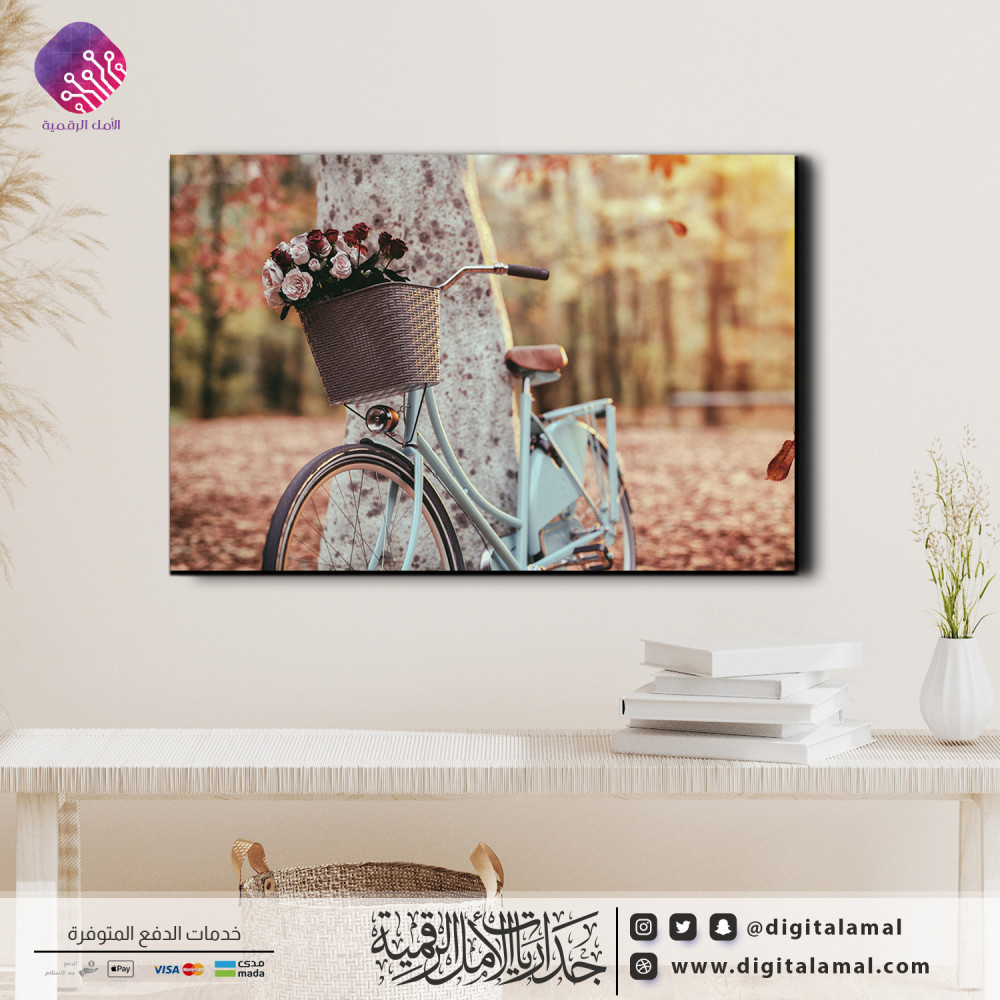 لوحة جدارية لدراجة هوائية من الطراز القديم في غابة-لوحة جدارية مصنوعة من خامة الكانفاس المشدودة على إطار مخفي متين،مصممة ومطبوعة بدقة واحترافية عالية باستخدام أجود أنواع الحبر لتتماشى مع ديكورات المقاهي والمنازل والمكاتب،تصميم عصري يضفي للمكان رونقاً وجمالاً