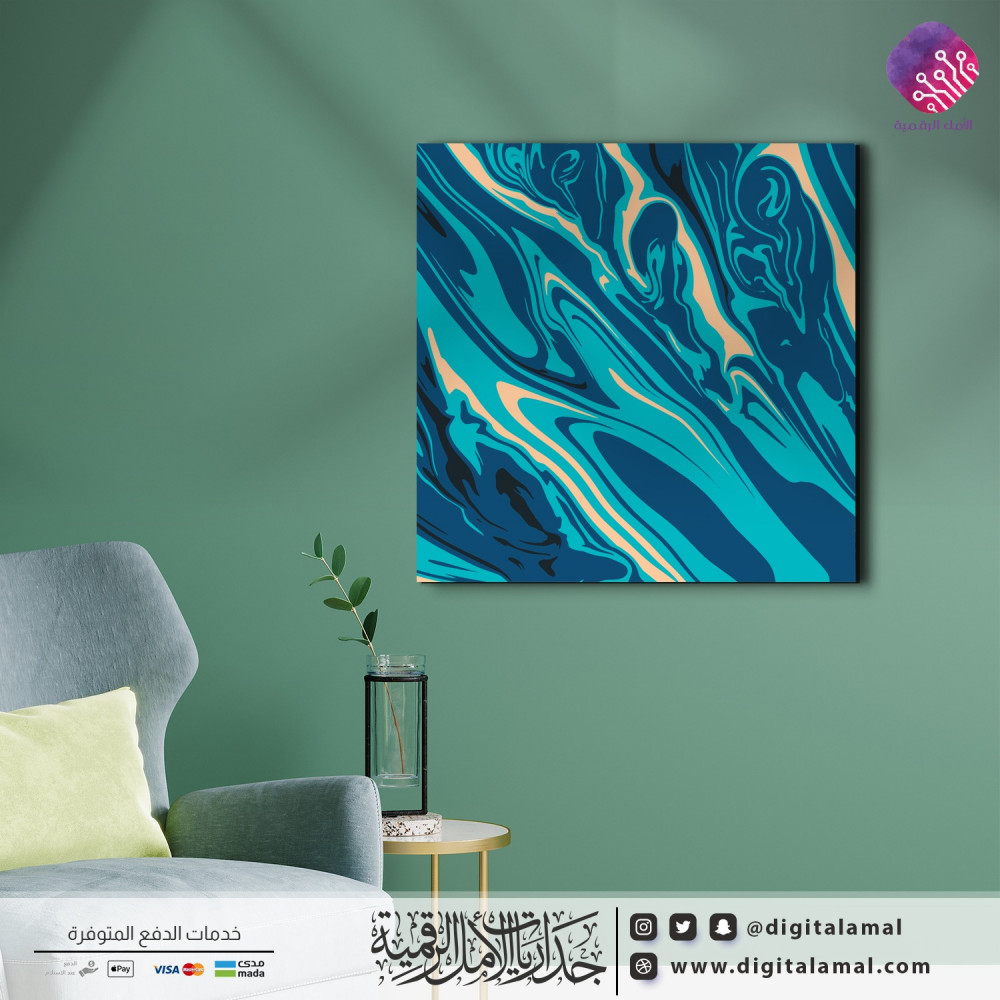 لوحة جدارية للفن التجريدي بألوان متناسقة من تدرجات الأزرق-لوحة جدارية مطبوعة بجودة ودقة عالية على خامة الكانفاس مع إطار مخفي ومصممة باحترافية وبعناية بأجود أنواع الأحبار لتتماشى مع مختلف أنواع الديكورات العصرية.