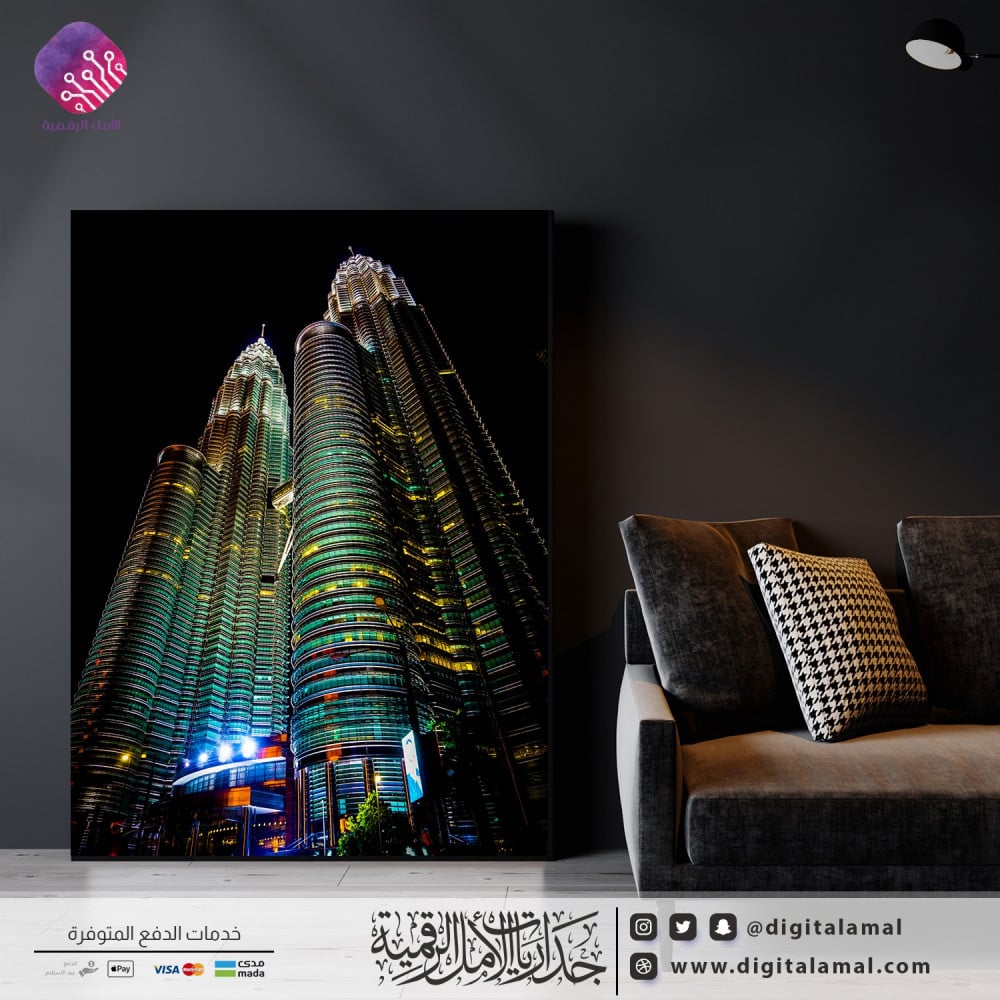 لوحة جدارية مميزة للبرج الوأم في كوالالامبور-لوحة جدارية مطبوعة بجودة ودقة عالية على خامة الكانفاس مع إطار مخفي ومصممة باحترافية وبعناية بأجود أنواع الأحبار لتتماشى مع مختلف أنواع الديكورات العصرية.