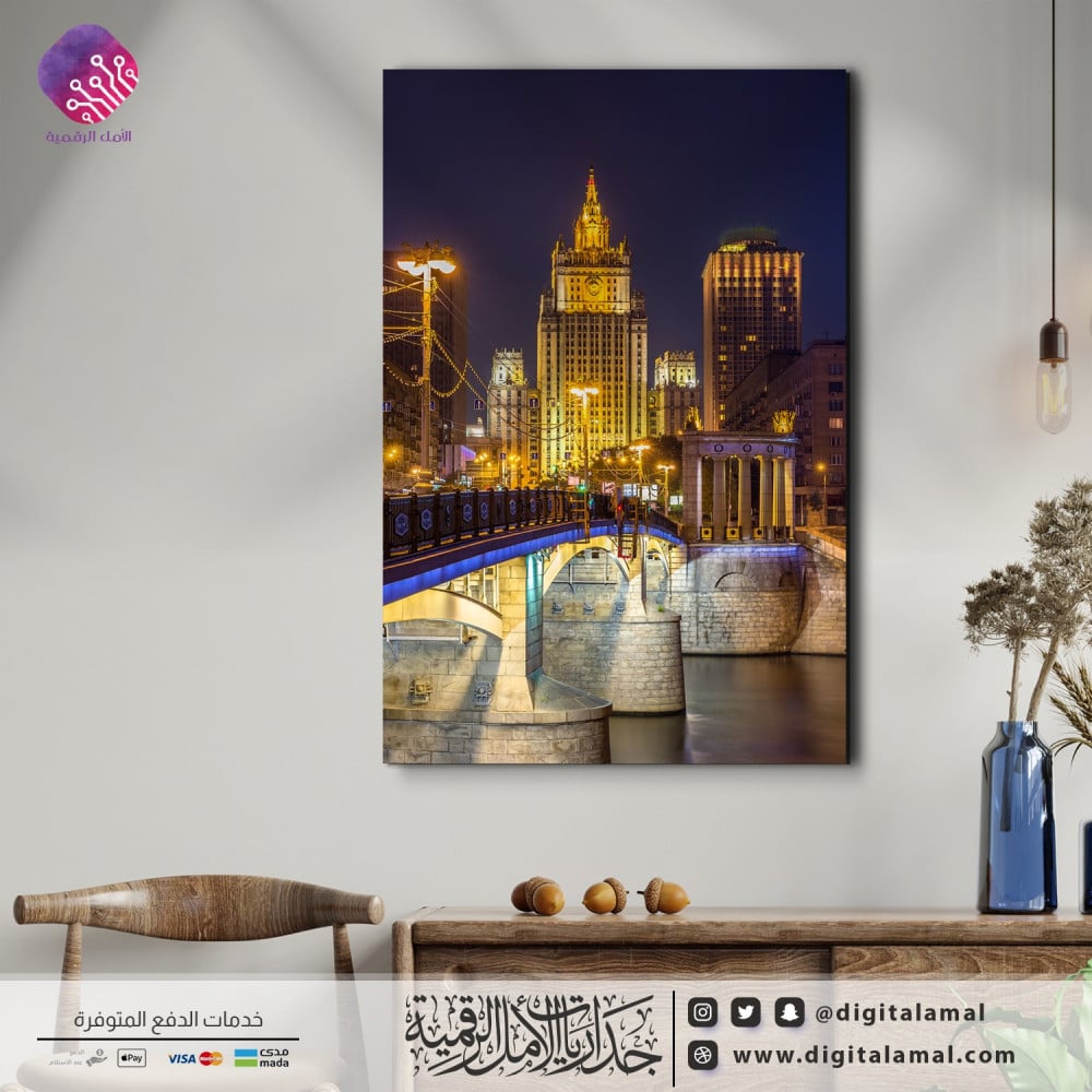 لوحة جدارية مميزة تظهر إحدى المدن المتطورة عمرانياً في الليل-لوحة جدارية مطبوعة بجودة ودقة عالية على خامة الكانفاس مع إطار مخفي ومصممة باحترافية وبعناية بأجود أنواع الأحبار لتتماشى مع مختلف أنواع الديكورات العصرية.