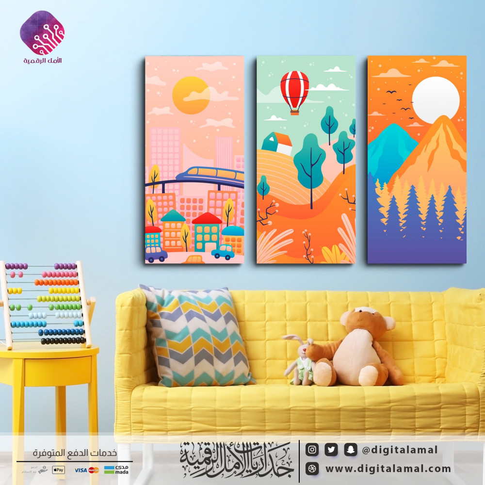 لوحات جدارية متعددة(لمدينة وغابة وريف)-ثلاث لوحات جدارية مصنوعة من خامة الكانفاس عالي الجودة مشدودة على إطار خشبي مخفي،تصميم مميز بأجود أنواع الحبر،تمت طباعتها بدقة واحترافية عالية لتصل إليك جاهزة للتعليق،تصميم عصري يناسب ديكورات المكاتب والمنازل وغيرها الكثير من الأماكن،تضفي بألوانها لمسة الأناقة والرقي للمكان