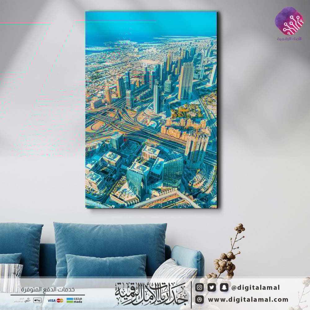 لوحة جدارية مميزة تظهر إحدى المدن المتطورة عمرانياً من الأعلى-لوحة جدارية مطبوعة بجودة ودقة عالية على خامة الكانفاس مع إطار مخفي ومصممة باحترافية وبعناية بأجود أنواع الأحبار لتتماشى مع مختلف أنواع الديكورات العصرية.