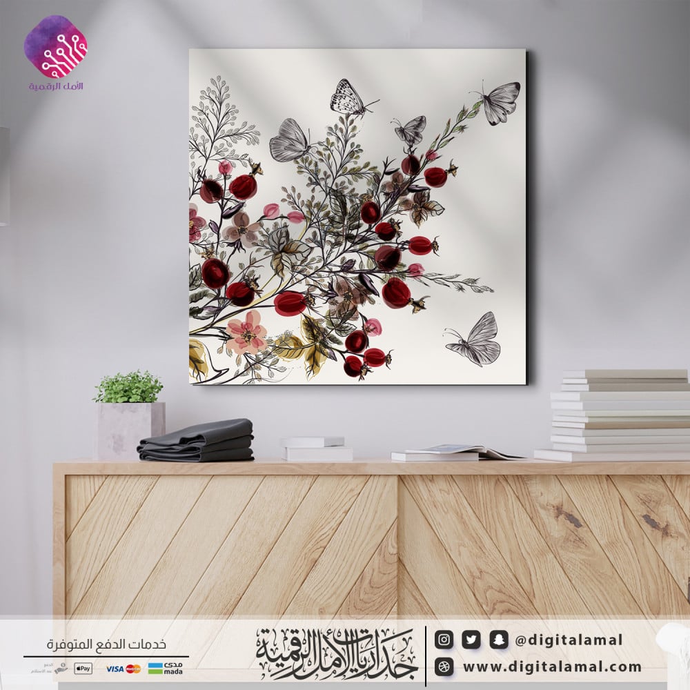 لوحة جدارية لفراشات وأزهار جميلة-لوحة جدارية مصنوعة من خامة الكانفاس عالي الجودة،مصممة ومطبوعة بدقة عالية وباستخدام أجود الأحبار ،تصميم عصري يتماشى مع ديكورات المنازل والمقاهي ،تأتي اللوحة بإطار مخفي، تضفي على المكان لمسة الأناقة والرقي