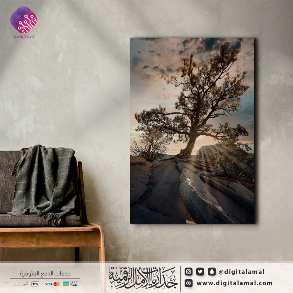 لوحة جدارية لشجرة كبيرة وتظهر خلفها السماء المليئة الغيوم-لوحة جدارية تظهر شجرة كبيرة والسماء المليئة بالغيوم في الخلف، مطبوعة بجودة ودقة عالية على خامة الكانفاس مع إطار مخفي مصممة باحترافية وبعناية بأجود أنواع الأحبار لتتماشى مع مختلف الديكورات العصرية.