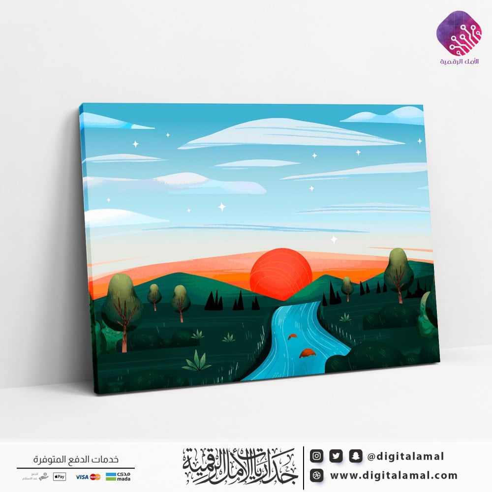 لوحة جدارية مميزة لإحدى الغابات حيث تظهر الشمس الساطعة في الخلف-لوحة جدارية مطبوعة بجودة ودقة عالية على خامة الكانفاس مع إطار مخفي ومصممة باحترافية وبعناية بأجود أنواع الأحبار لتتماشى مع مختلف أنواع الديكورات العصرية.
