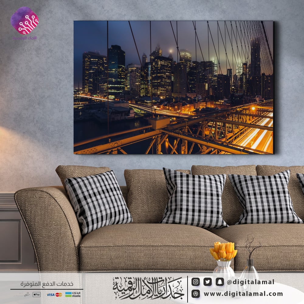لوحة جدارية مميزة لإحدى المدن ملتقطة فوق الجسر ليلاً-لوحة جدارية مطبوعة بجودة ودقة عالية على خامة الكانفاس مع إطار مخفي ومصممة باحترافية وبعناية بأجود أنواع الأحبار لتتماشى مع مختلف أنواع الديكورات العصرية.