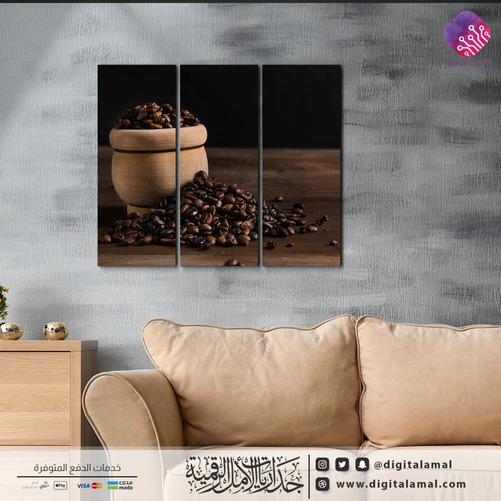 لوحات جدارية متعددة لحبات من البن-لوحات متعددة من قماش الكانفاس،مكونة من 3 اجزاء،مصممة ومطبوعة باستخدام أجود انواع الأحبار مع إطار مخفي تصميم راقي يتماشى مع ديكورات المنازل والمقاهي ومتاجر البن،تضفي على المكان لمسة الأناقة والرقي