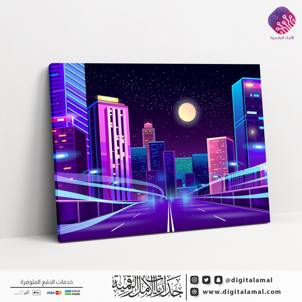 لوحة جدارية لإحدى المدن وفي الخلف قمر عملاق-لوحة جدارية مطبوعة بجودة ودقة عالية على خامة الكانفاس مع إطار مخفي ومصممة باحترافية وبعناية بأجود أنواع الأحبار لتتماشى مع مختلف أنواع الديكورات العصرية.