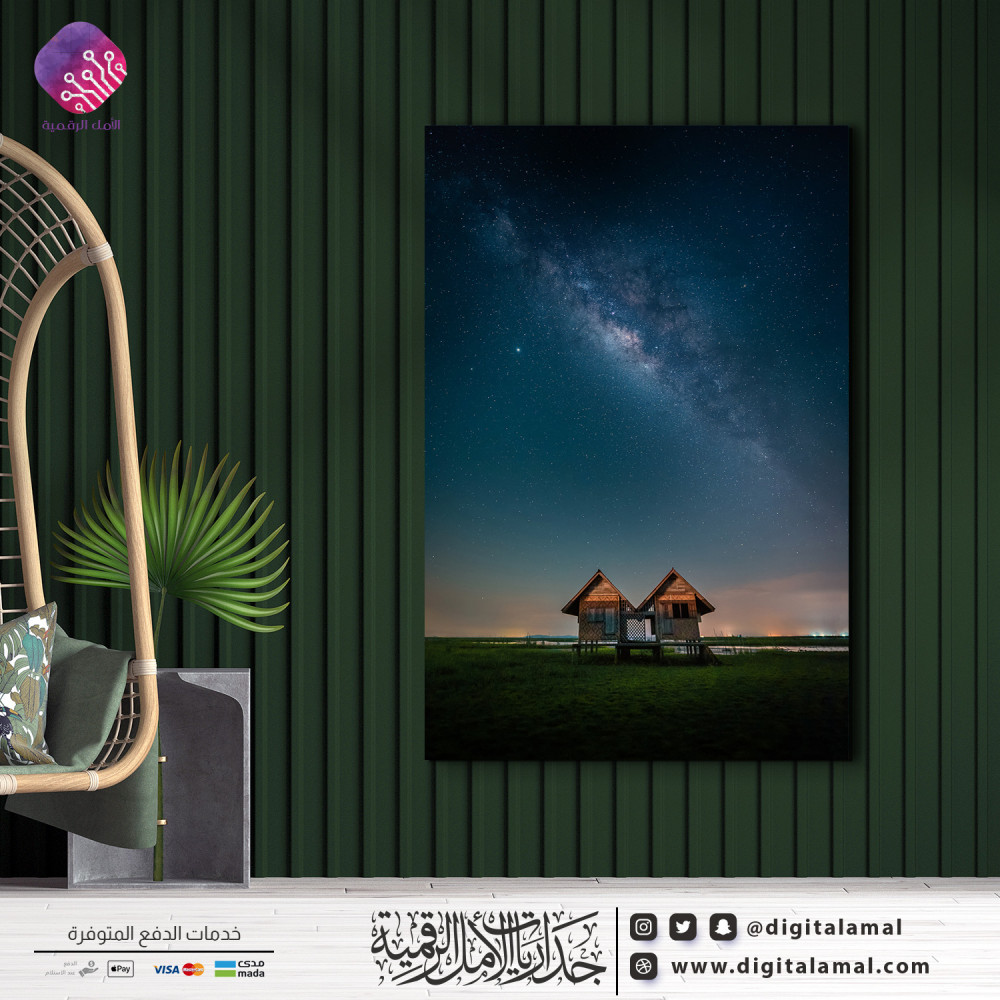 لوحة جدارية لبيت خشبي وخلفه سماء مليئة بالنجوم-لوحة جدارية تظهر بيت خشبي والسماء المليئة بالنجوم في الخلف، مطبوعة بجودة ودقة عالية على خامة الكانفاس مع إطار مخفي مصممة باحترافية وبعناية بأجود أنواع الأحبار لتتماشى مع مختلف الديكورات العصرية.