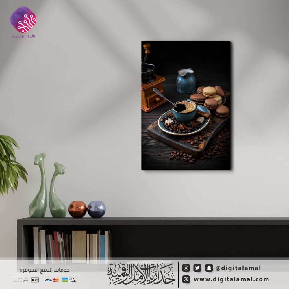 لوحة جدارية لفنجان قهوة وقطع من الحلوى-لوحة جدارية لفنجان قهوة وقطع من الحلوى مصنوعة من قماش الكانفاس وأجود انواع الحبر مع اطار مخفي، تحمل الأناقة والرقي على جدران المقاهي والمنازل.