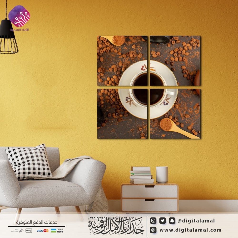 لوحات جدارية متعددة لكوب من القهوة والبن المطحون-لوحات جدارية مكونة من 4 اجزاء مصنوعة من خامة الكانفاس المشدود على إطار مخفي،مصممة ومطبوعة بدقة عالية باستخدام أجواد انواع الحبر لتحمل معها كل معاني الرقي والجودة العالية،تصميم عصري جميل يتماشى مع ديكورات عديدة مثل المقاهي والمنازل ومتاجر القهوة
