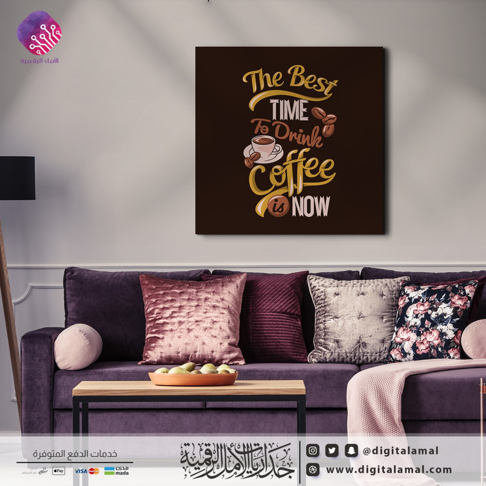 لوحة جدارية بتصميم بديع لعبارة(the best time to drink coffee is now)-لوحة حائط بتصميم رائع وجذاب مصنوعة من اجود انواع الأحبار على خامة الكانفاس مع إطار مخفي ،تتماشى مع ديكورات متاجر القهوة والمقاهي وحتى المنازل ،تعطي المكان لمسة الأناقة والرقي