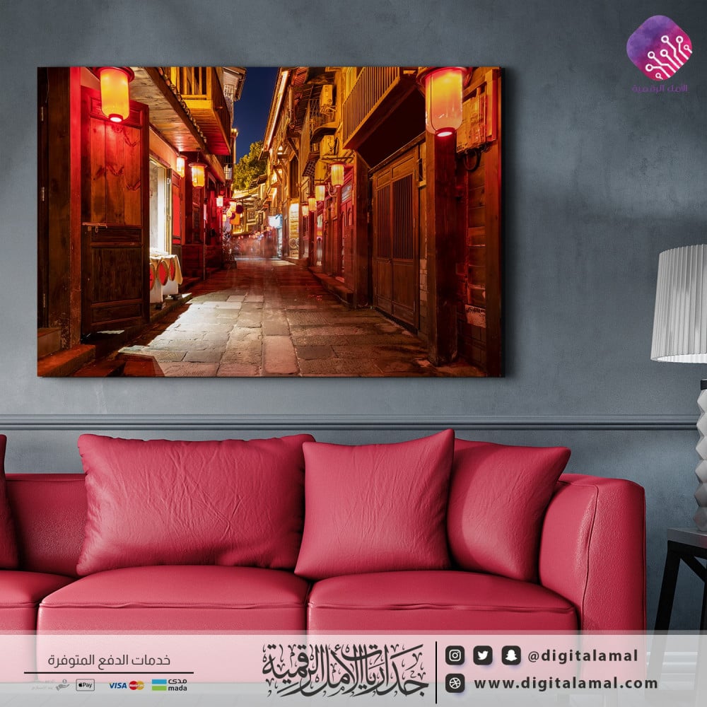 لوحة جدارية مميزة لأحد الشوارع الضيقة-لوحة جدارية مطبوعة بجودة ودقة عالية على خامة الكانفاس مع إطار مخفي ومصممة باحترافية وبعناية بأجود أنواع الأحبار لتتماشى مع مختلف أنواع الديكورات العصرية.