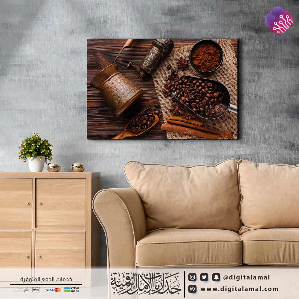 لوحة جدارية لأدوات طحن البن وصنع القهوة-لوحة حائط مصنوعة من خامة الكانفاس مع إطار مخفي ،مطبوعة بأجود الأحبار، تصميم جميل وعصري ويتماشى مع ديكورات المنازل والمقاهي وحتى متاجر القهوة،تضفي على المكان رونقاً وجمالاً