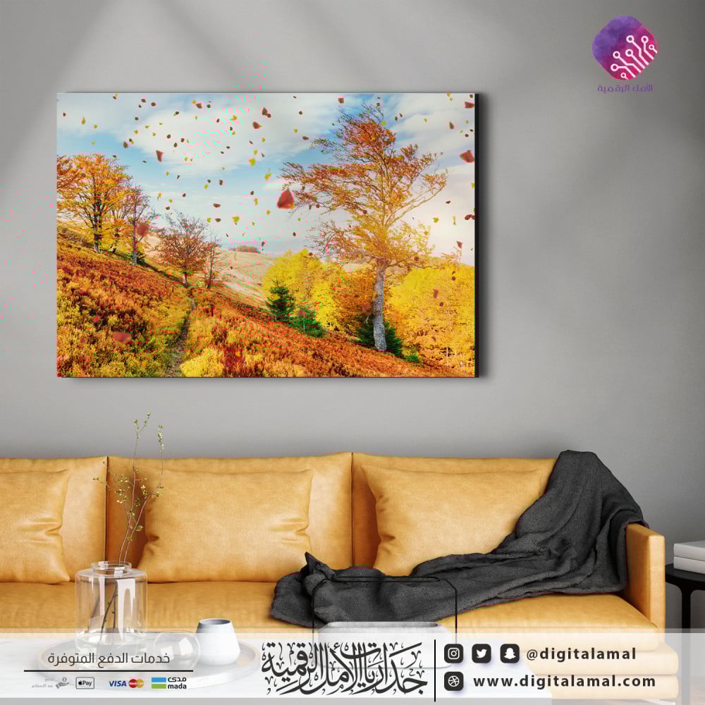 لوحة جدارية مميزة لإحدى الغابات في فصل الخريف-لوحة جدارية مطبوعة بجودة ودقة عالية على خامة الكانفاس مع إطار مخفي ومصممة باحترافية وبعناية بأجود أنواع الأحبار لتتماشى مع مختلف أنواع الديكورات العصرية.