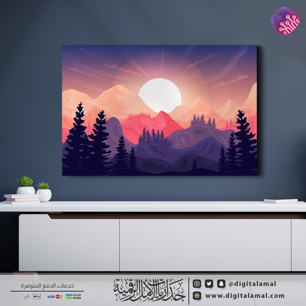 لوحة جدارية مميزة لغروب الشمس في إحدى الغابات-لوحة جدارية مطبوعة بجودة ودقة عالية على خامة الكانفاس مع إطار مخفي ومصممة باحترافية وبعناية بأجود أنواع الأحبار لتتماشى مع مختلف أنواع الديكورات العصرية.