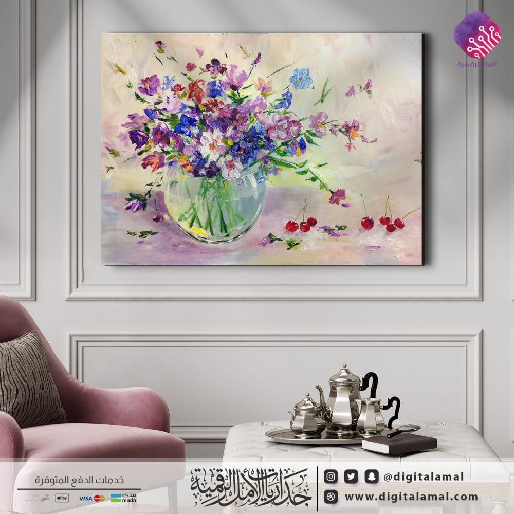 لوحة جدارية لرسم فني لإناء يحوي أزهار-لوحة جدارية مصنوعة من خامة الكانفاس المشدودة على إطار مخفي متين،مصممة ومطبوعة بدقة واحترافية عالية باستخدام أجود أنواع الحبر لتتماشى مع ديكورات المقاهي والمنازل والمكاتب،تصميم عصري يضفي للمكان رونقاً وجمالاً