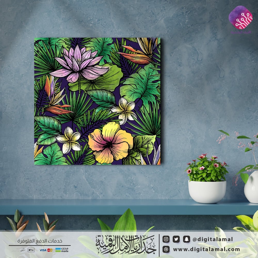 لوحة جدارية لمجموعة من النباتات مع أزهار-لوحة جدارية مصنوعة من خامة الكانفاس عالي الجودة،مصممة ومطبوعة بدقة عالية وباستخدام أجود الأحبار ،تصميم عصري يتماشى مع ديكورات المنازل والمقاهي ،تأتي اللوحة بإطار مخفي، تضفي على المكان لمسة الأناقة والرقي