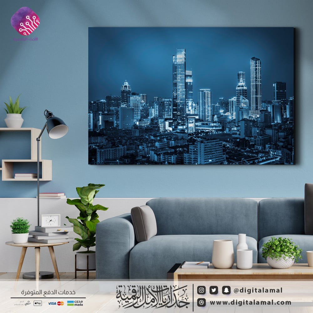 لوحة جدارية مميزة لإحدى المدن المتطورة عمرانياً في الليل-لوحة جدارية مطبوعة بجودة ودقة عالية على خامة الكانفاس مع إطار مخفي ومصممة باحترافية وبعناية بأجود أنواع الأحبار لتتماشى مع مختلف أنواع الديكورات العصرية.