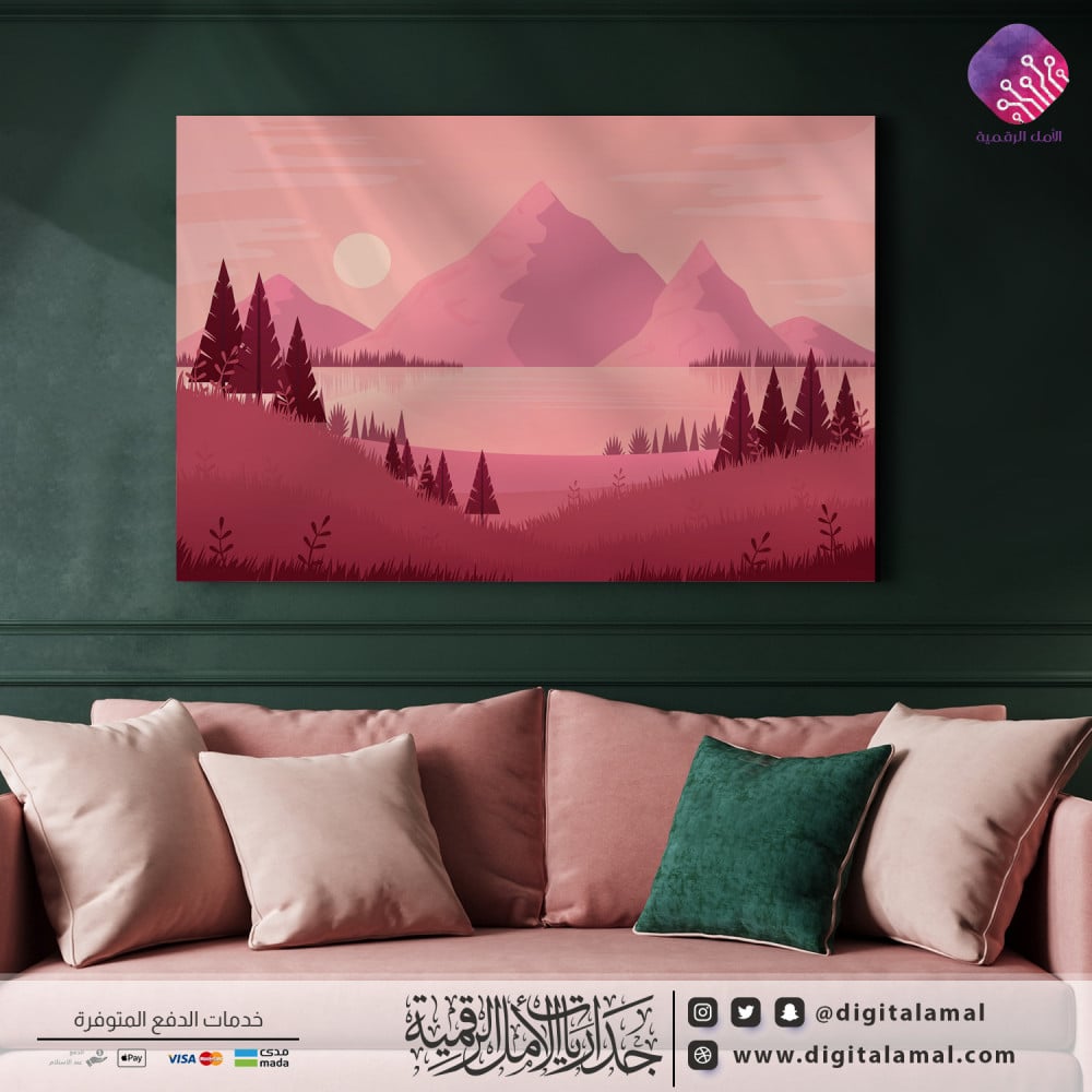 لوحة جدارية مميزة لإحدى الغابات وأمامها البحيرة وجبال-لوحة جدارية مطبوعة بجودة ودقة عالية على خامة الكانفاس مع إطار مخفي ومصممة باحترافية وبعناية بأجود أنواع الأحبار لتتماشى مع مختلف أنواع الديكورات العصرية.