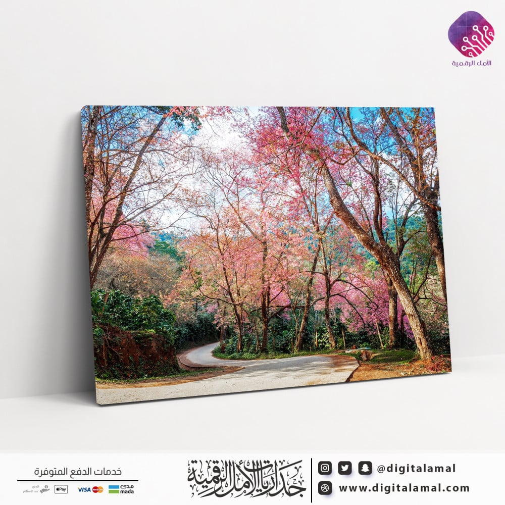 لوحة جدارية مميزة لطريق ملتف في غابة من الأشجار أثناء فصل الربيع-لوحة جدارية مطبوعة بجودة ودقة عالية على خامة الكانفاس مع إطار مخفي ومصممة باحترافية وبعناية بأجود أنواع الأحبار لتتماشى مع مختلف أنواع الديكورات العصرية.