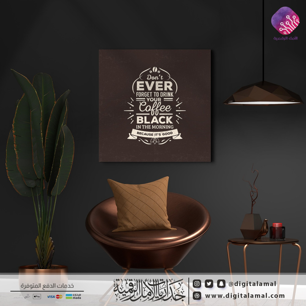لوحة جدارية لعبارة(don't ever forget drink your coffee black)-لوحة حائط تحمل لمسة الأناقة والرقي ،مصنوعة من قماش الكانفاس ومطبوعة بأجود الأحبار، وتأتي بإطار مخفي تتماشى مع ديكورات المقاهي ومتاجر القهوة والمنازل