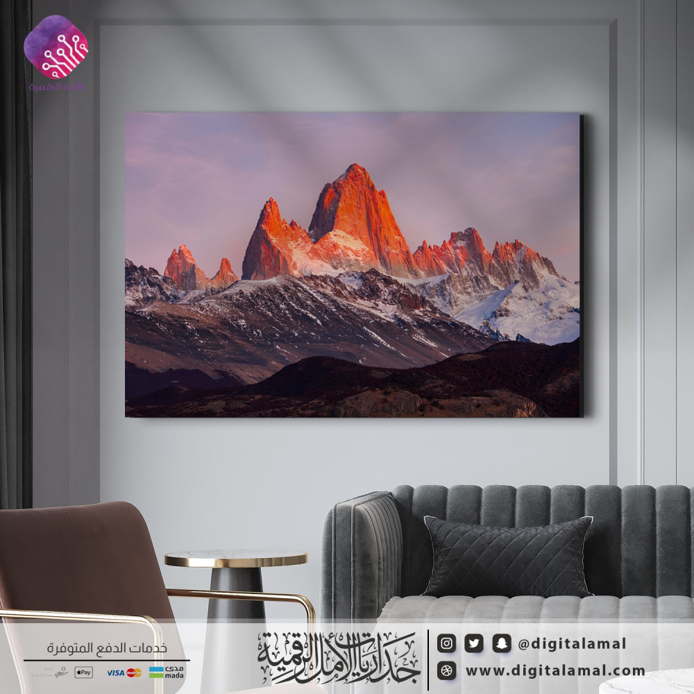 لوحة جدارية لمنظر طبيعي لقمم جبال مع الثلوج-لوحة جدارية بتصميم جذاب مصنوعة من أفخم أنواع الأحبار على قماش الكانفاس بألوان متميزة تظهر قمم جبال وثلوج،تتماشى مع الديكورات العصرية للمنازل والمقاهي.