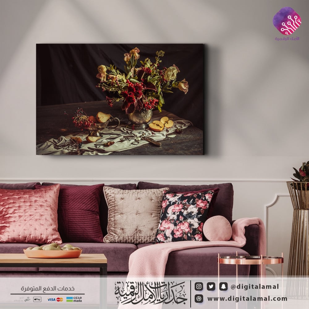 لوحة جدارية لباقة من الورود في إناء وثمار من الفاكهة-لوحة جدارية مصنوعة من خامة الكانفاس عالي الجودة،مصممة ومطبوعة بدقة عالية وباستخدام أجود الأحبار ،تصميم عصري يتماشى مع ديكورات المنازل والمقاهي ،تأتي اللوحة بإطار مخفي، تضفي على المكان لمسة الأناقة والرقي